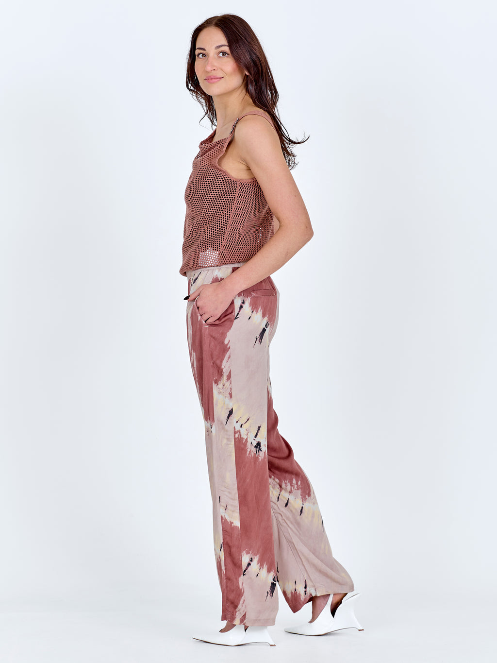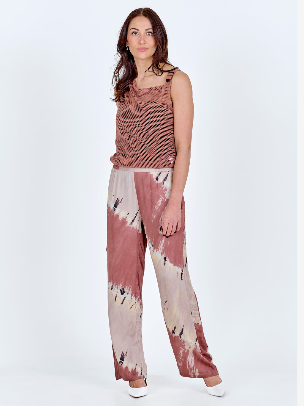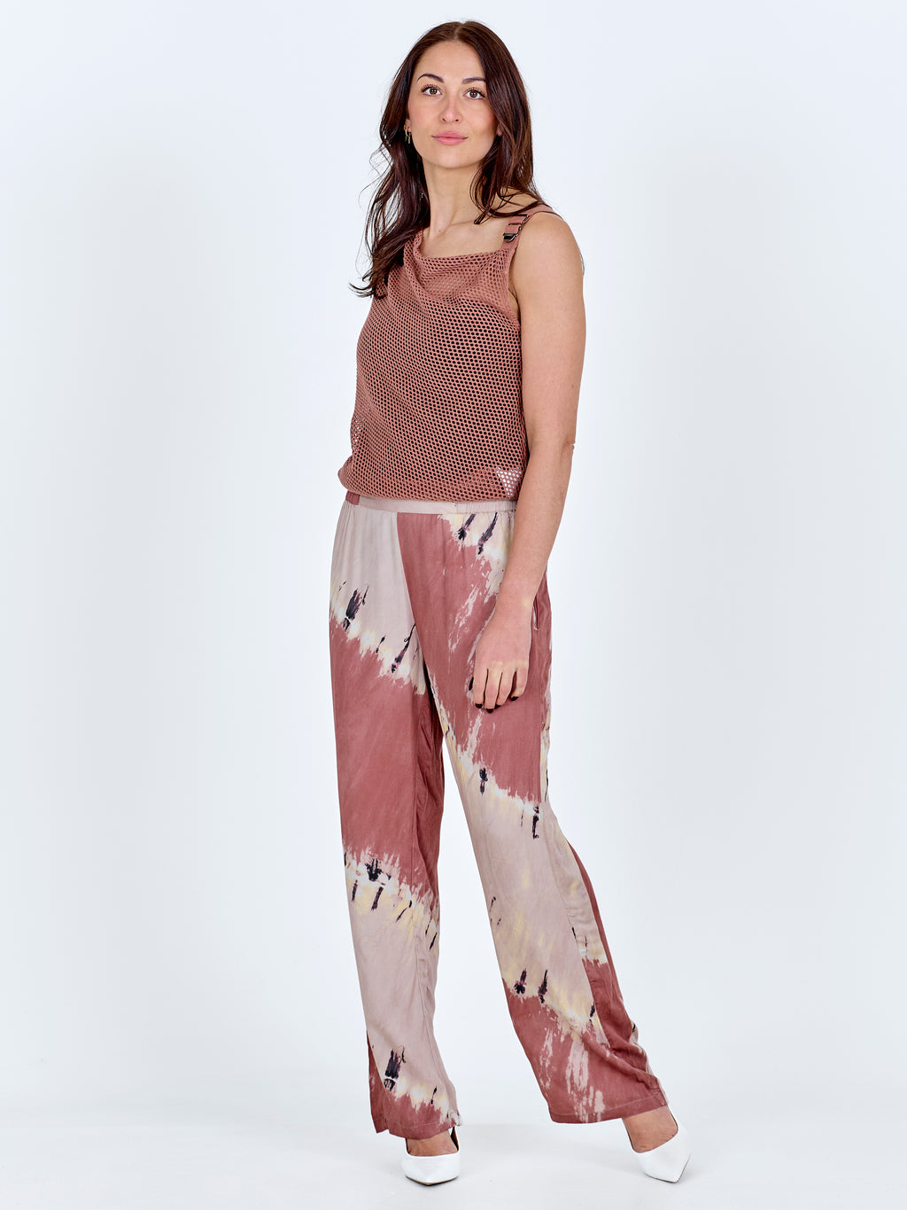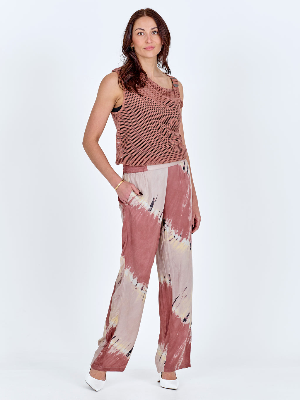 Dieses Oberteil hat einen leichten und einfachen Look mit einem Lochmuster und einem lockeren, asymmetrischen Schnitt. Es fällt sanft über den Körper und hat einen breiten Träger, der ihm ein entspanntes, aber durchdachtes Aussehen verleiht. Die Rückseite ist schlicht und leicht transparent. Tragen Sie es über ein Top oder unter einem Blazer für einen markanten Look.