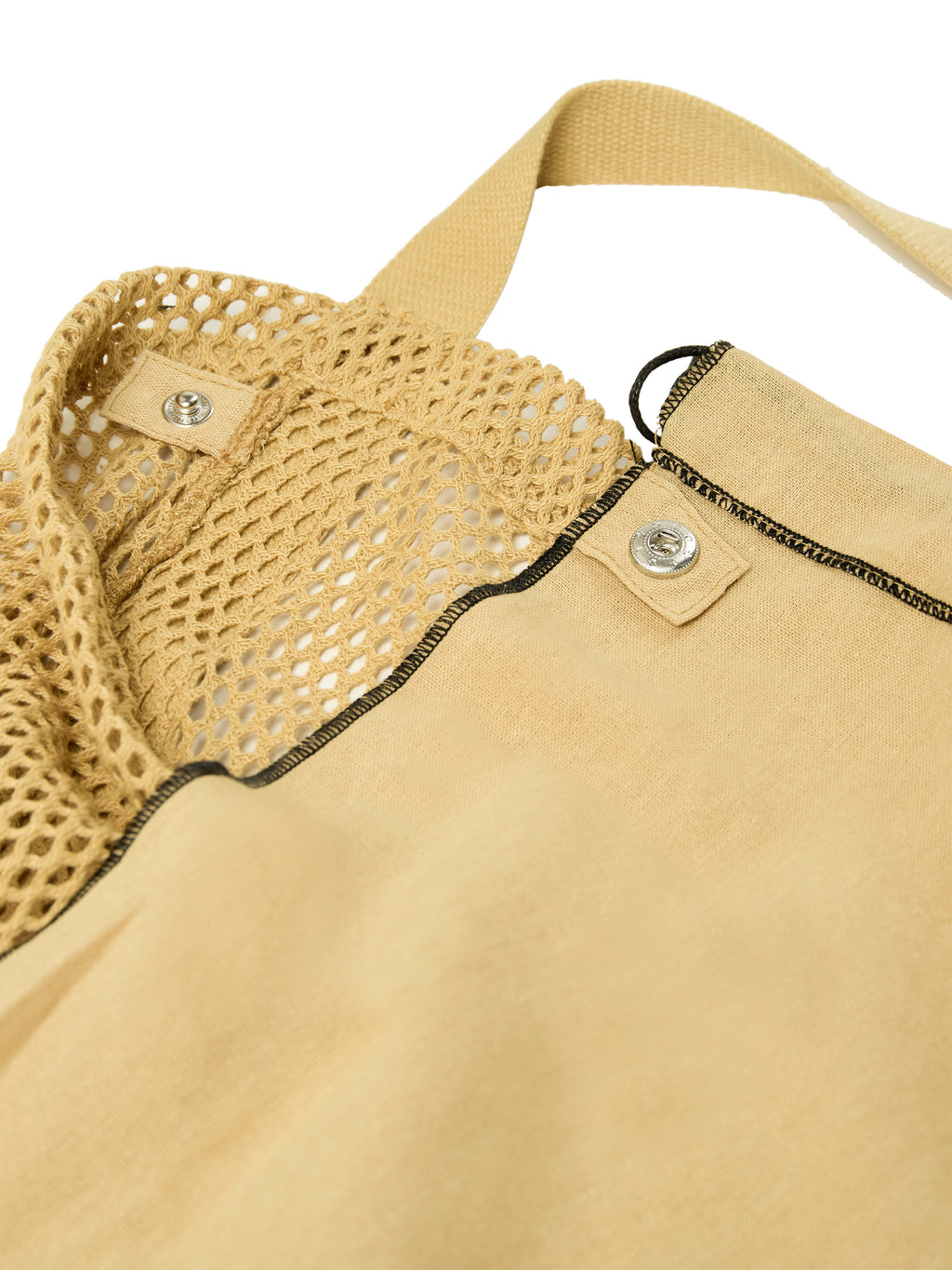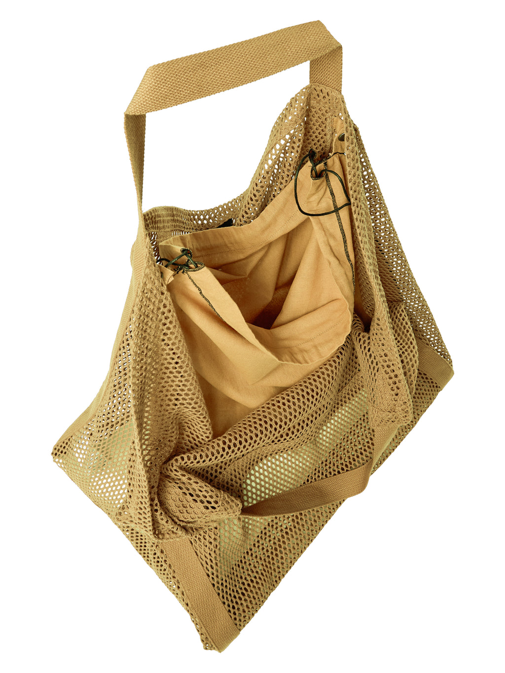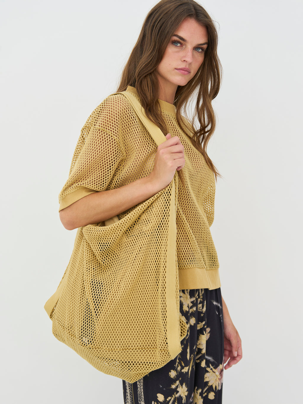 Diese Tasche ist in einem offenen Lochmuster gefertigt, das ihr ein leichtes und raues Aussehen verleiht. Die geräumige Form macht sie praktisch für den täglichen Gebrauch, während die breiten Riemen dafür sorgen, dass sie bequem über der Schulter getragen werden kann. Die Tasche kann sowohl als lässige Alltagstasche als auch als zusätzlicher Akzent zu deinem Outfit dienen, wobei die Struktur im Mittelpunkt steht.