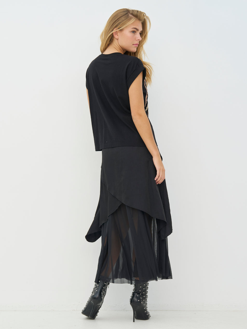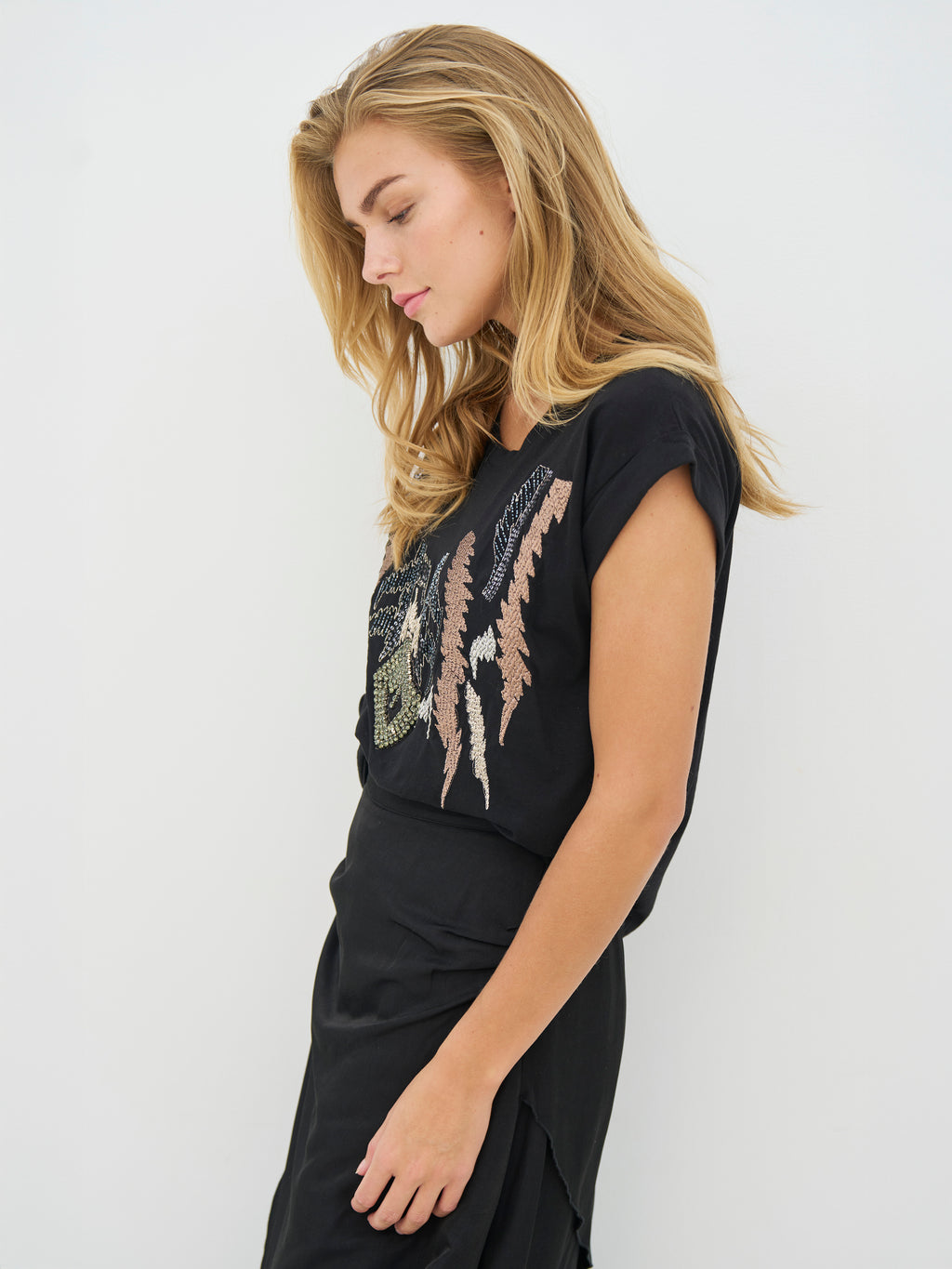 Dieses T-Shirt hat einen einfachen Schnitt mit kurzen Ärmeln und einem runden Halsausschnitt, aber bekommt seinen besonderen Ausdruck von den detailreichen Stickereien und aufgenähten Perlen auf der Vorderseite. Die Kombination von Stickerei und Perlen schafft Tiefe und verleiht einen dekorativen Fokus, ohne zu schwer zu wirken. Der Rücken ist ganz einfach gehalten und balanciert das Aussehen schön aus. Kombinieren Sie das T-Shirt mit Jeans, weiten Hosen oder unter einem offenen Blazer, wenn das Outfit etwas mehr Charakter haben soll.