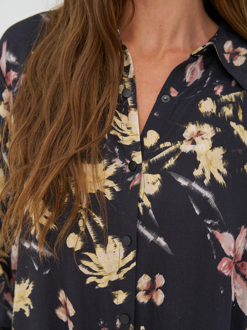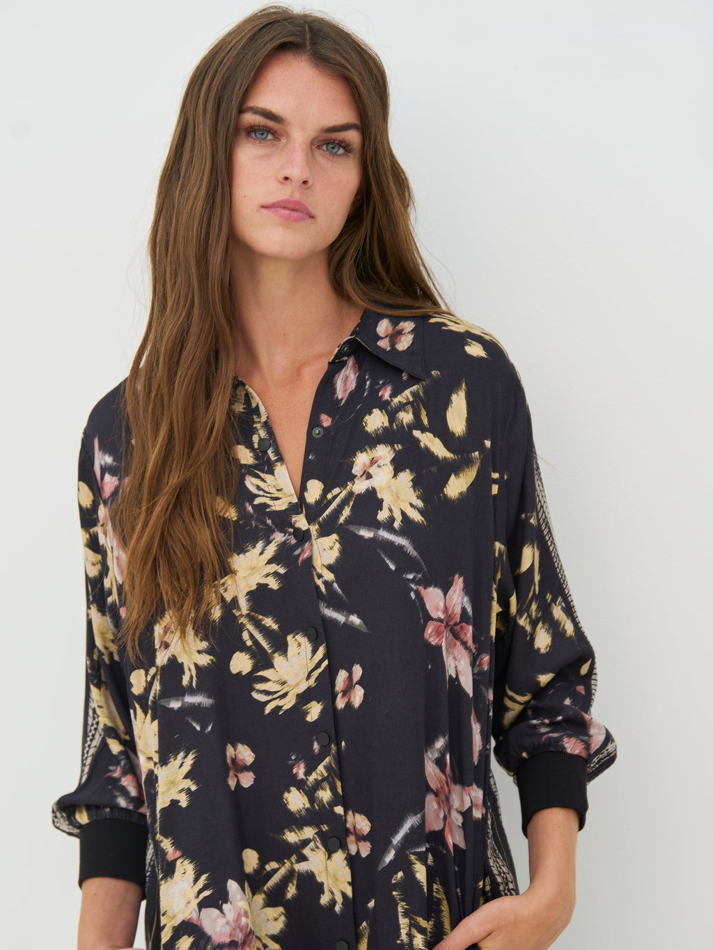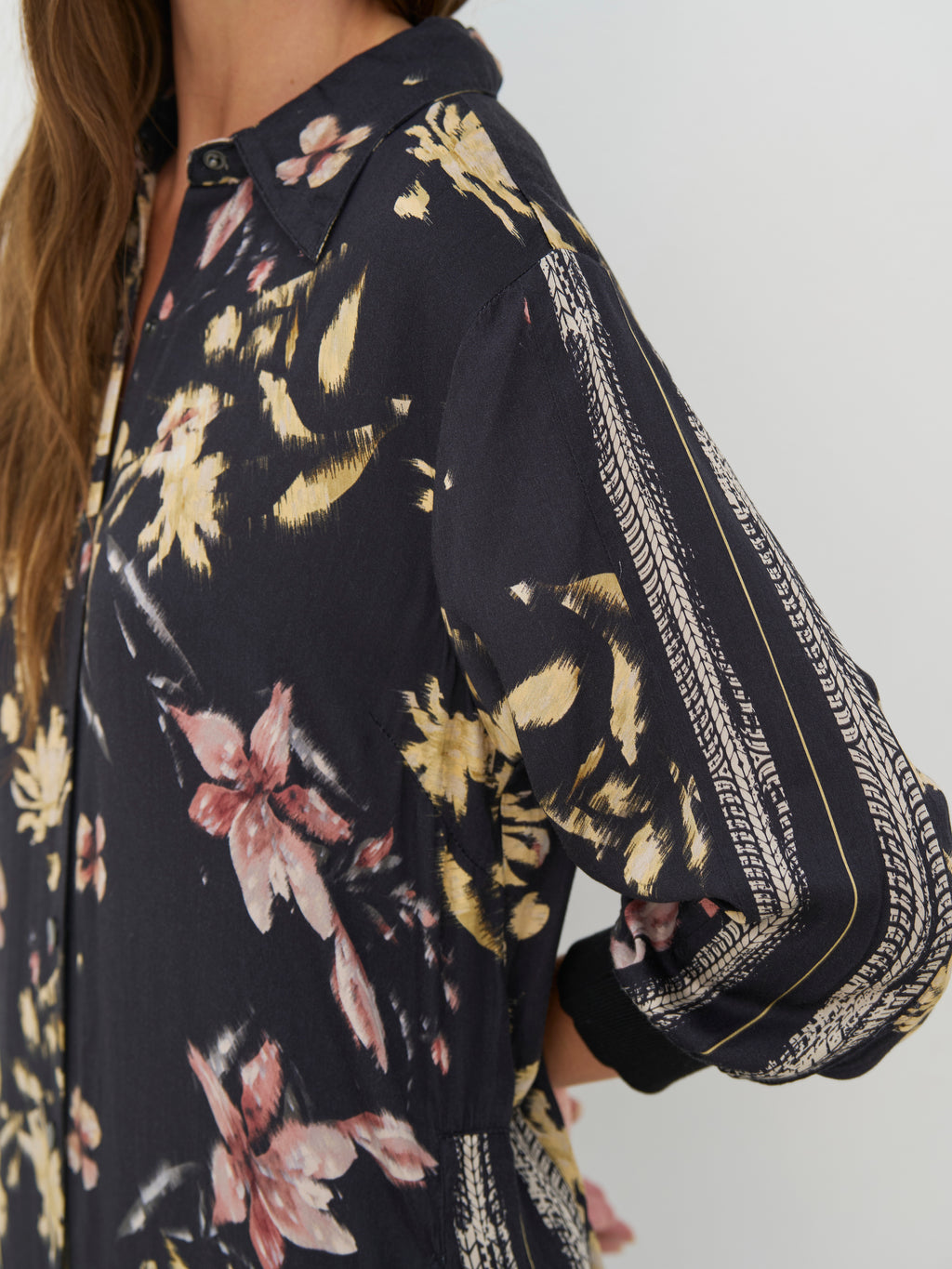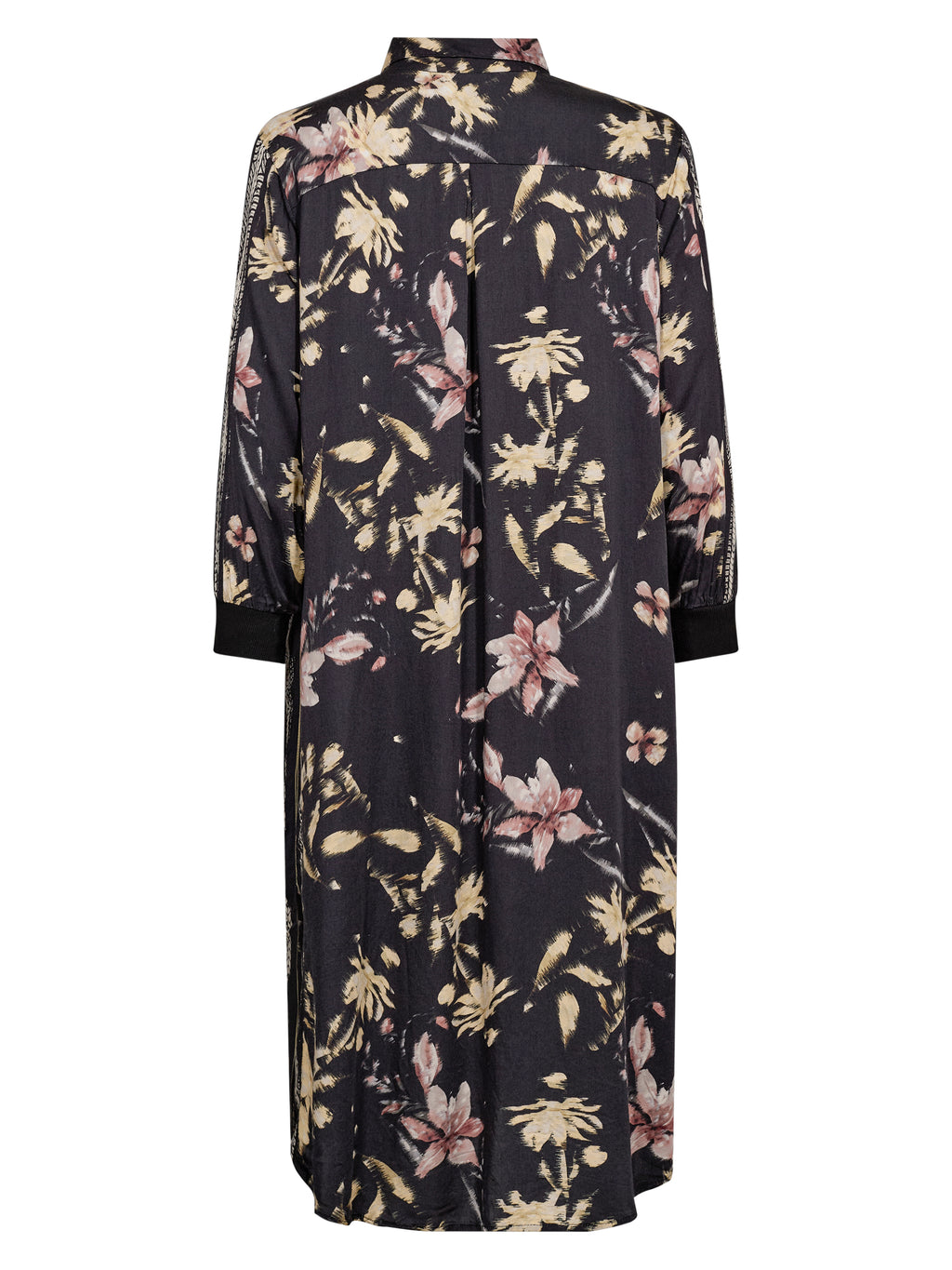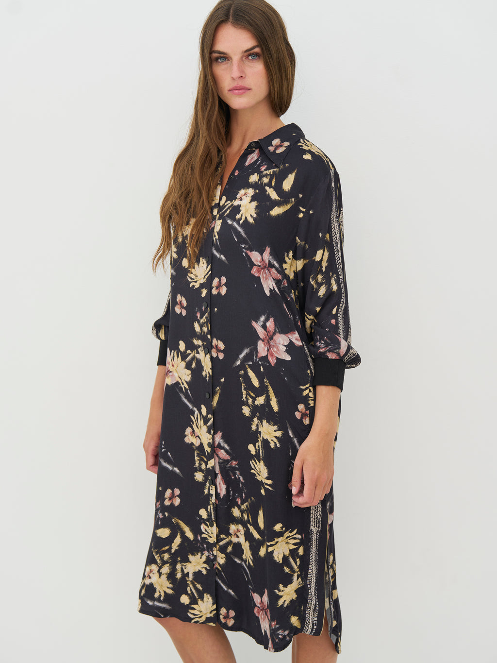 Dieses Kleid hat einen entspannten und vielseitigen Look mit durchgehender Knopfleiste und klassischem Kragen. Der Druck verleiht dem Kleid Charakter, während die langen Ärmel mit Manschetten den Look ordentlich halten. An den Seiten befinden sich Schlitze, die zusätzliche Bewegungsfreiheit bieten und das Tragen angenehm machen. Der Rücken ist schlicht und fällt gerade herunter. Tragen Sie das Kleid allein oder offen über Hosen und ein Oberteil.