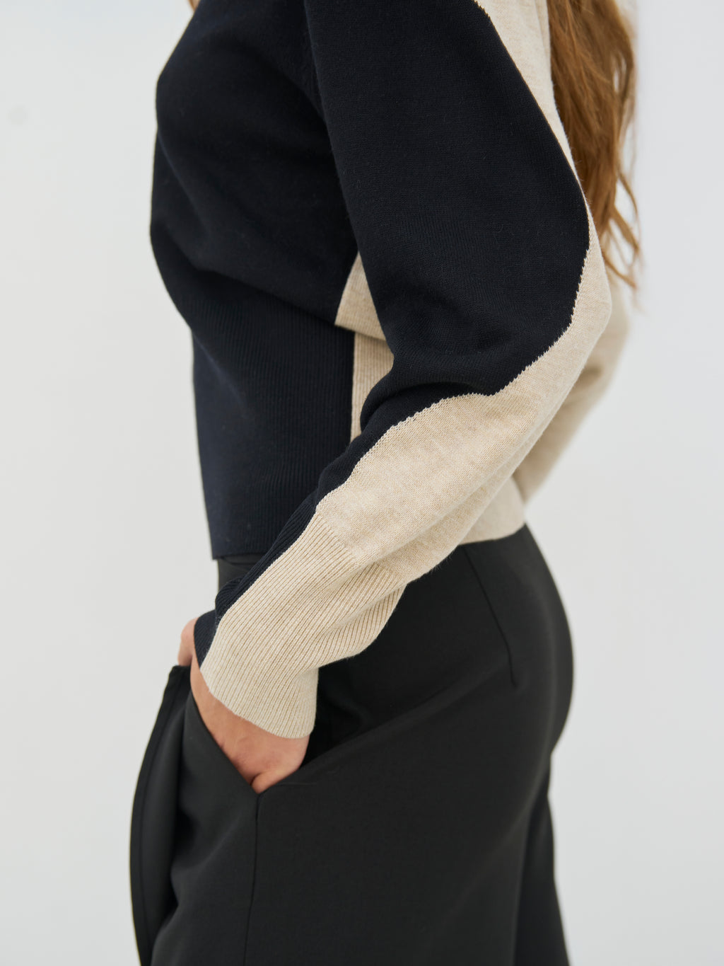 Dieser gestrickte Pullover hat einen schlichten, aber markanten Ausdruck mit Kontrastpanels, die dem Design ein grafisches Spiel verleihen. Der Pullover hat einen klassischen V-Ausschnitt, während die Rückseite ruhiger ist und für Ausgewogenheit im Gesamtbild sorgt. Die langen Ärmel folgen den gleichen Kontrastdetails und sorgen für ein stimmiges Erscheinungsbild aus allen Blickwinkeln. Kombinieren Sie den Pullover mit einer klassischen Hose oder einem Rock für ein legeres, aber durchdachtes Alltagsoutfit.