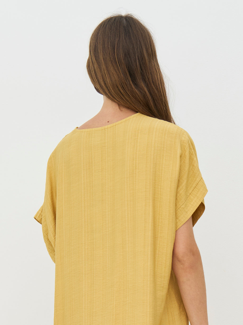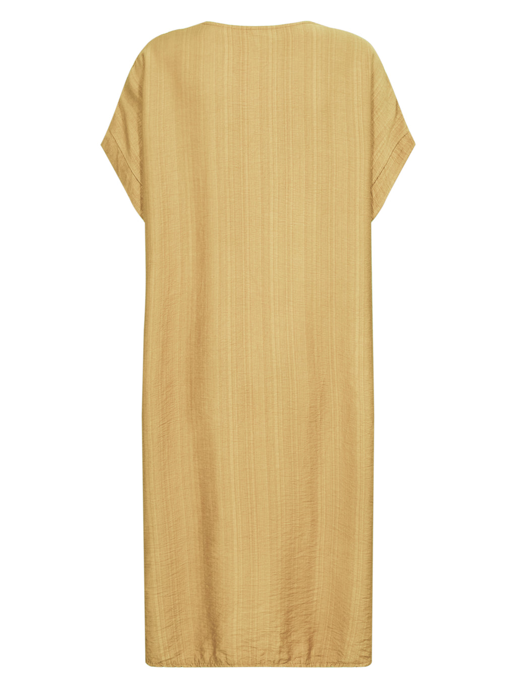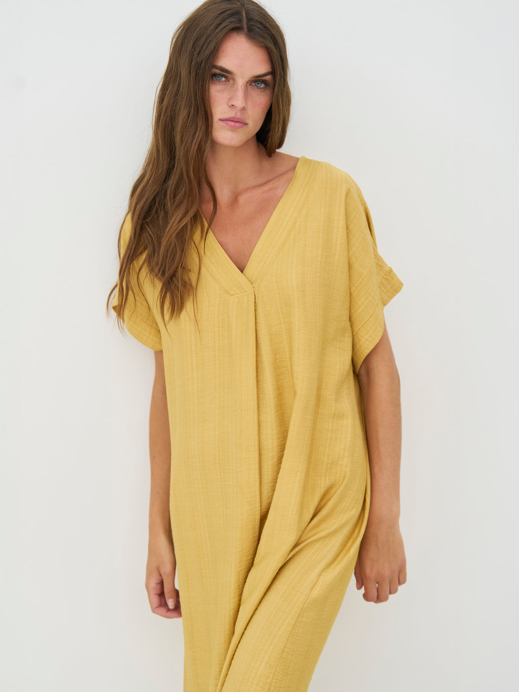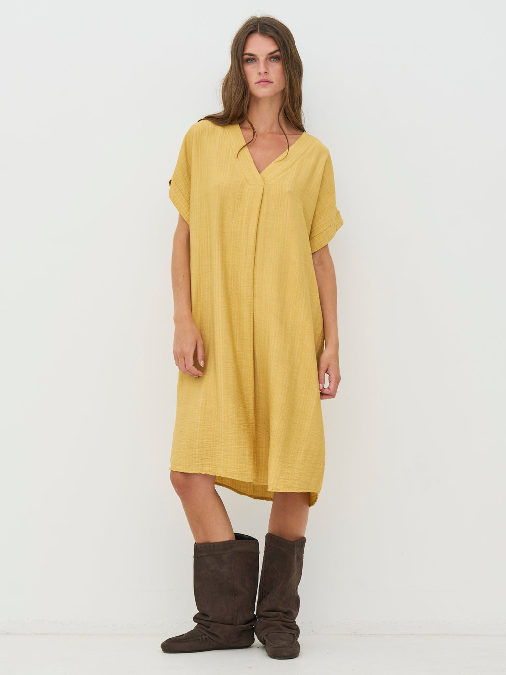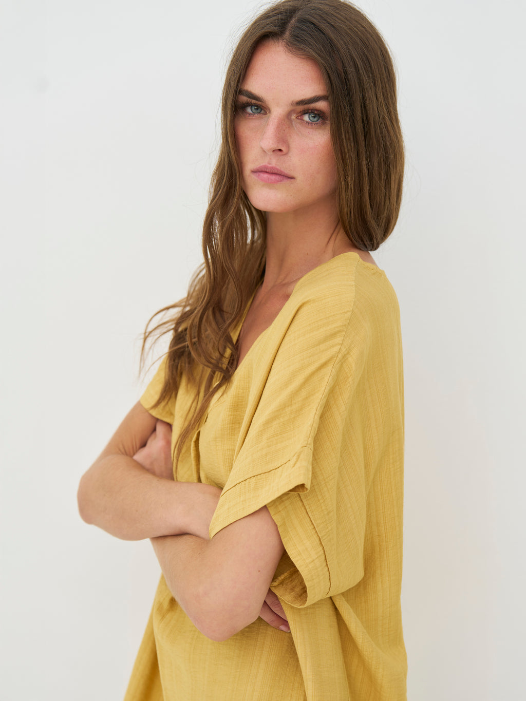 Diese Tunika hat einen entspannten und einfachen Look mit einer geraden Passform, die sanft entlang des Körpers fällt. Der elegante V-Ausschnitt sorgt für ein offenes und luftiges Erscheinungsbild, während die kurzen Ärmel das Silhouette einfach und vielseitig halten. Die Länge macht es den ganzen Tag über angenehm zu tragen und einfach zu stylen, entweder alleine als Kleid oder mit flachen Schuhen und Accessoires für einen entspannteren Look.