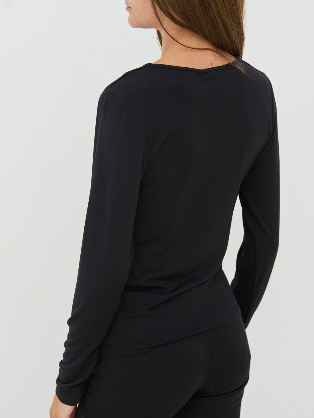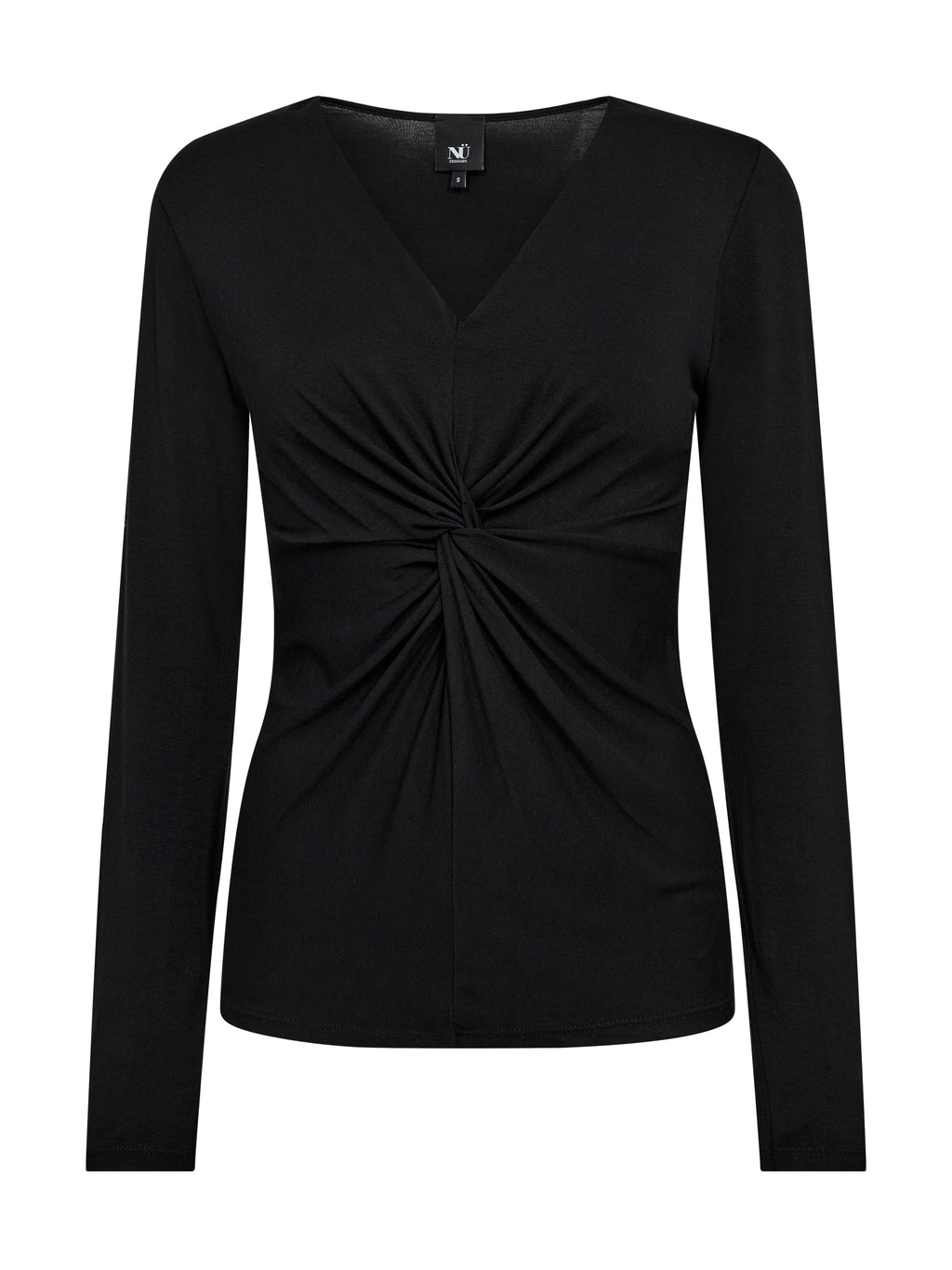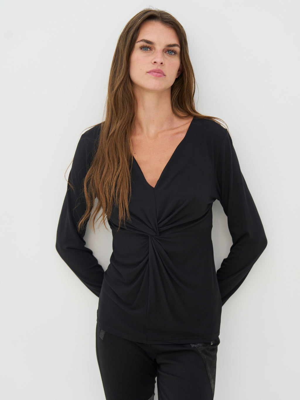 Diese Bluse hat einen femininen und einfachen Ausdruck mit langen Ärmeln und einem vorteilhaften V-Ausschnitt. Die Vorderseite ist an der Taille zu einer dekorativen Knoten gebunden, was zu einem weichen Fall führt und der Silhouette eine schöne Form verleiht, während die Rückseite im Erscheinungsbild einfacher und glatter ist. Die Bluse fällt schön am Körper, ohne eng zu wirken. Kombiniere sie mit Hosen oder einem Rock für einen perfekten Alltagslook und füge eine Jacke für ein vollständigeres Outfit hinzu.