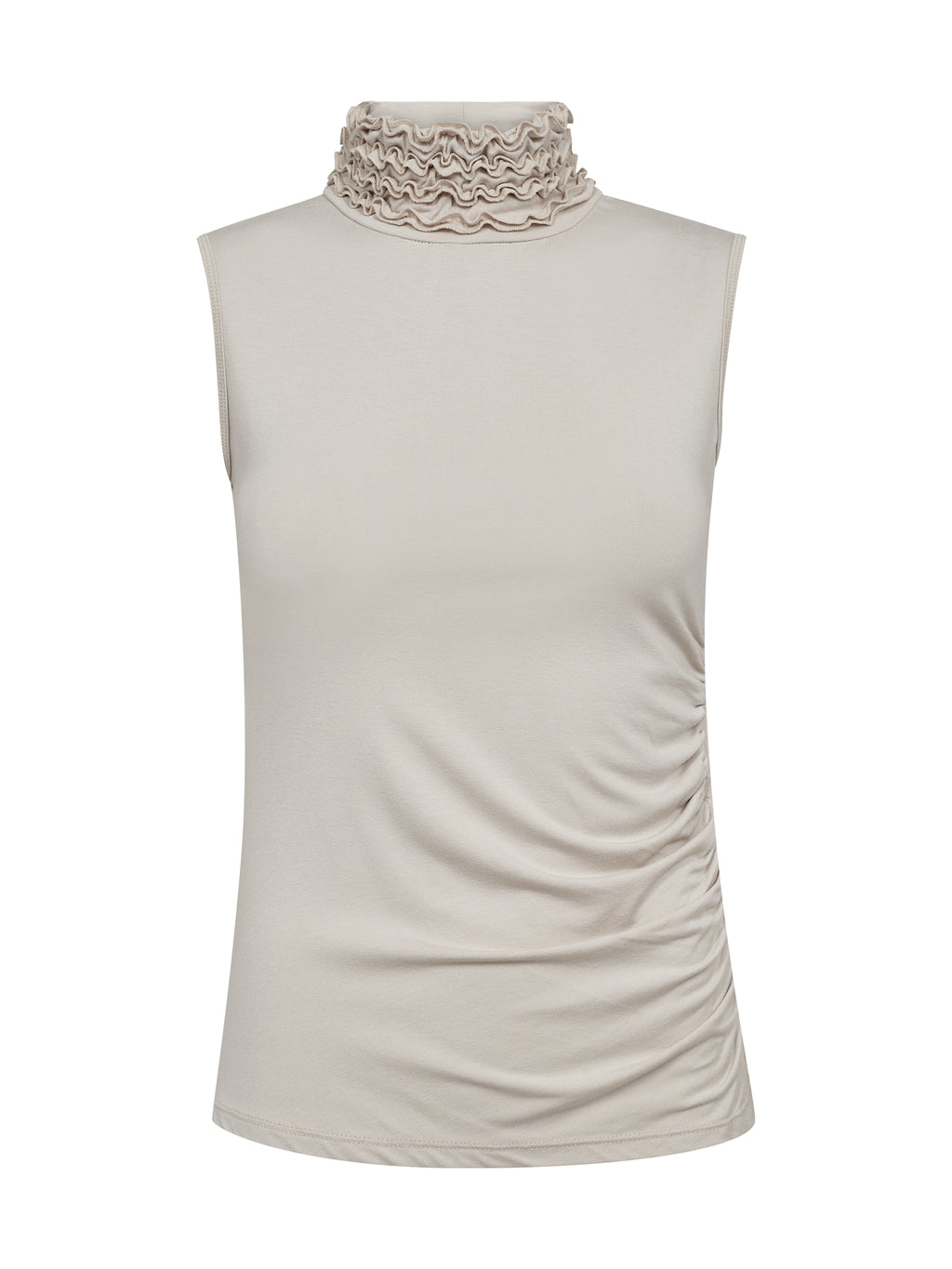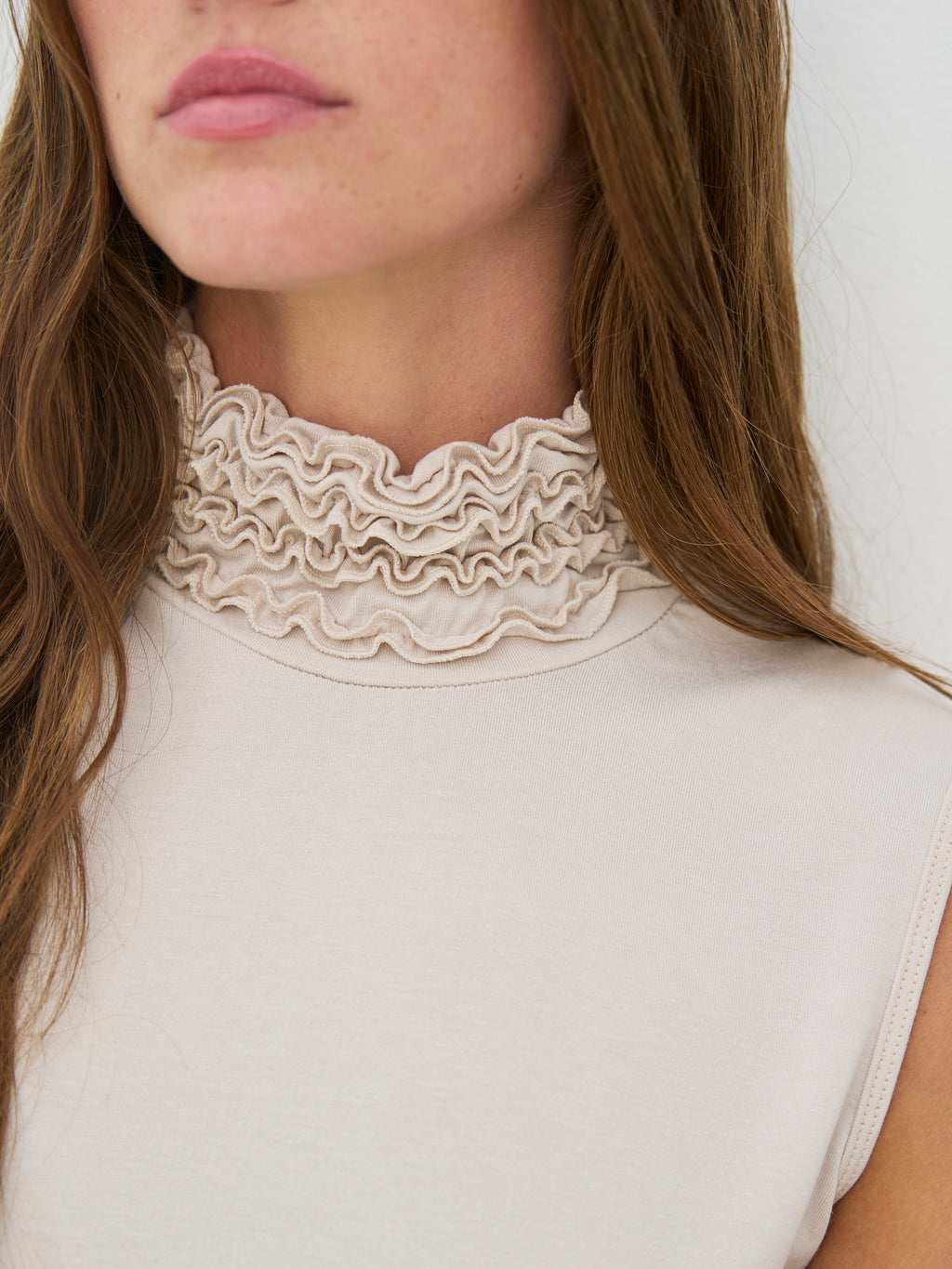 Dieses Top hat ein einfaches und feminines Aussehen mit einer eng anliegenden Passform und einem hohen Hals, der mit feinen, weichen Rüschen verziert ist. Die Vorderseite ist glatt und ruhig, während die Seite mit leichten Raffungen versehen ist, die Form und Bewegung verleihen. Stilisieren Sie das Oberteil unter einer Jacke oder einem Cardigan oder tragen Sie es allein mit Hosen, Shorts oder einem Rock für ein elegantes Alltagsoutfit.