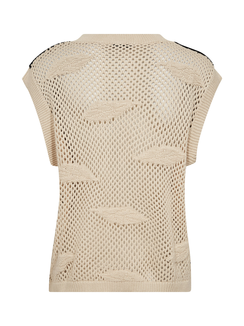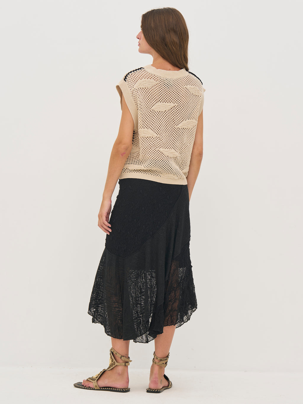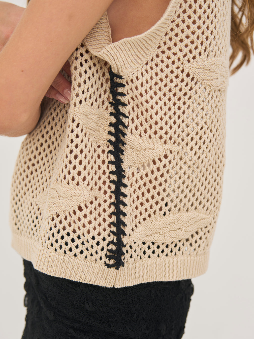Diese gestrickte Weste hat einen leichten und luftigen Look mit einem offenen Strickmuster, das Struktur und ein modernes Aussehen bietet. Die eingearbeiteten Muster fügen ein rauhes Detail hinzu, während die groben Kontrastnähte an Schultern und Seiten eine auffällige Wendung erzeugen. Die lockere Passform mit weiten Armausschnitten sorgt für eine entspannte Silhouette, und das offene Design setzt sich am Rücken fort.