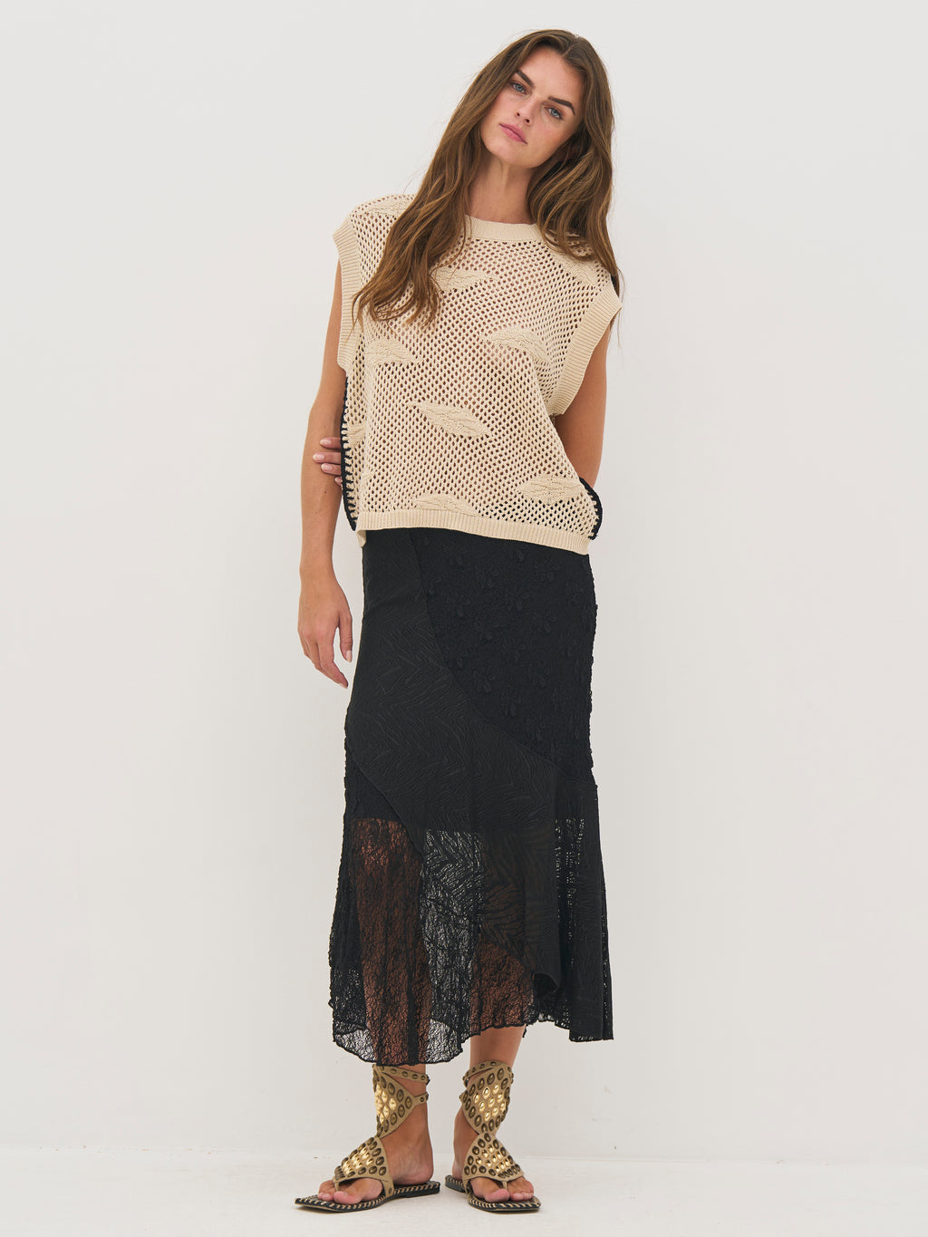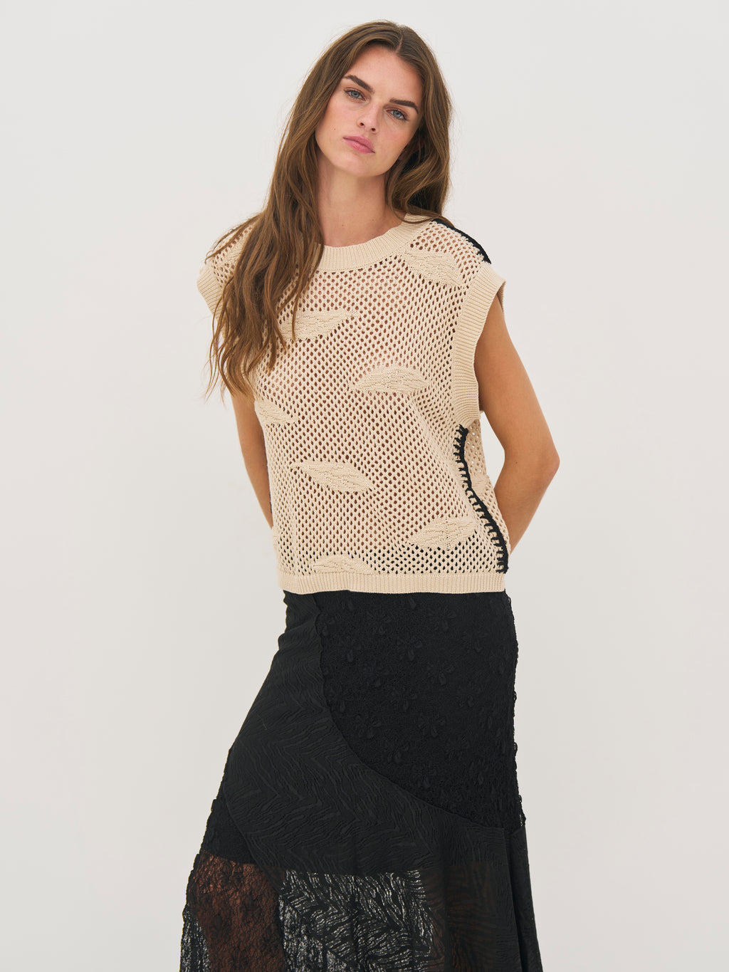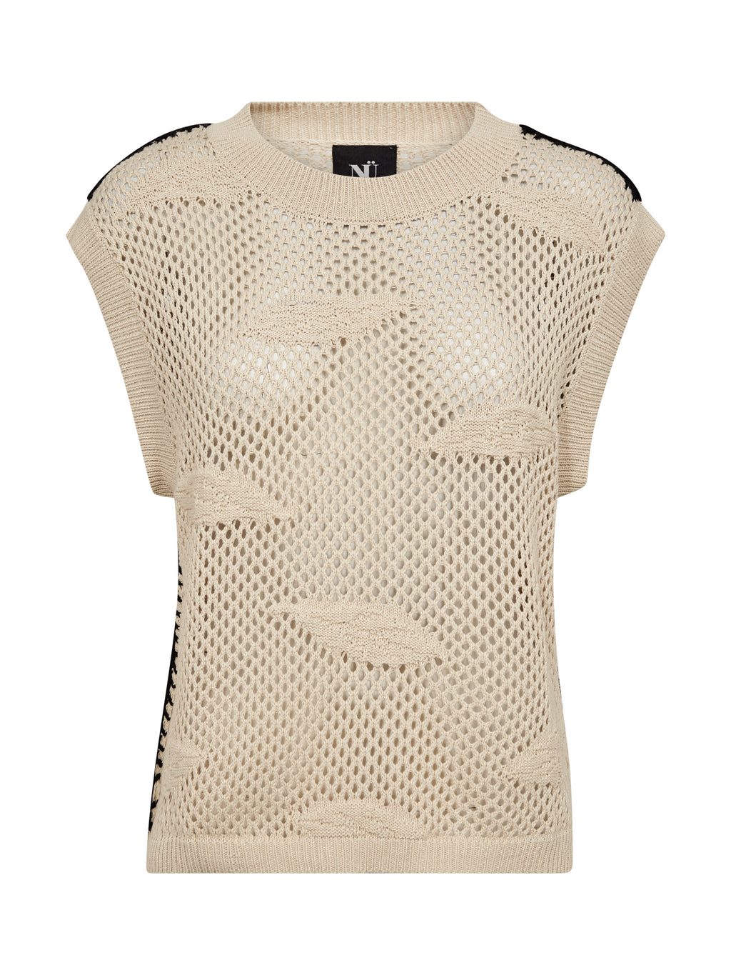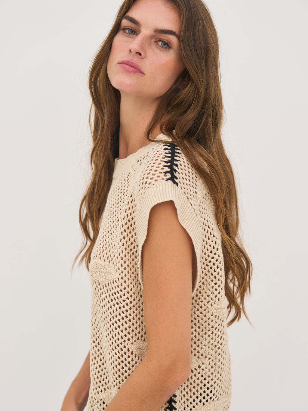 Diese gestrickte Weste hat einen leichten und luftigen Look mit einem offenen Strickmuster, das Struktur und ein modernes Aussehen bietet. Die eingearbeiteten Muster fügen ein rauhes Detail hinzu, während die groben Kontrastnähte an Schultern und Seiten eine auffällige Wendung erzeugen. Die lockere Passform mit weiten Armausschnitten sorgt für eine entspannte Silhouette, und das offene Design setzt sich am Rücken fort.
