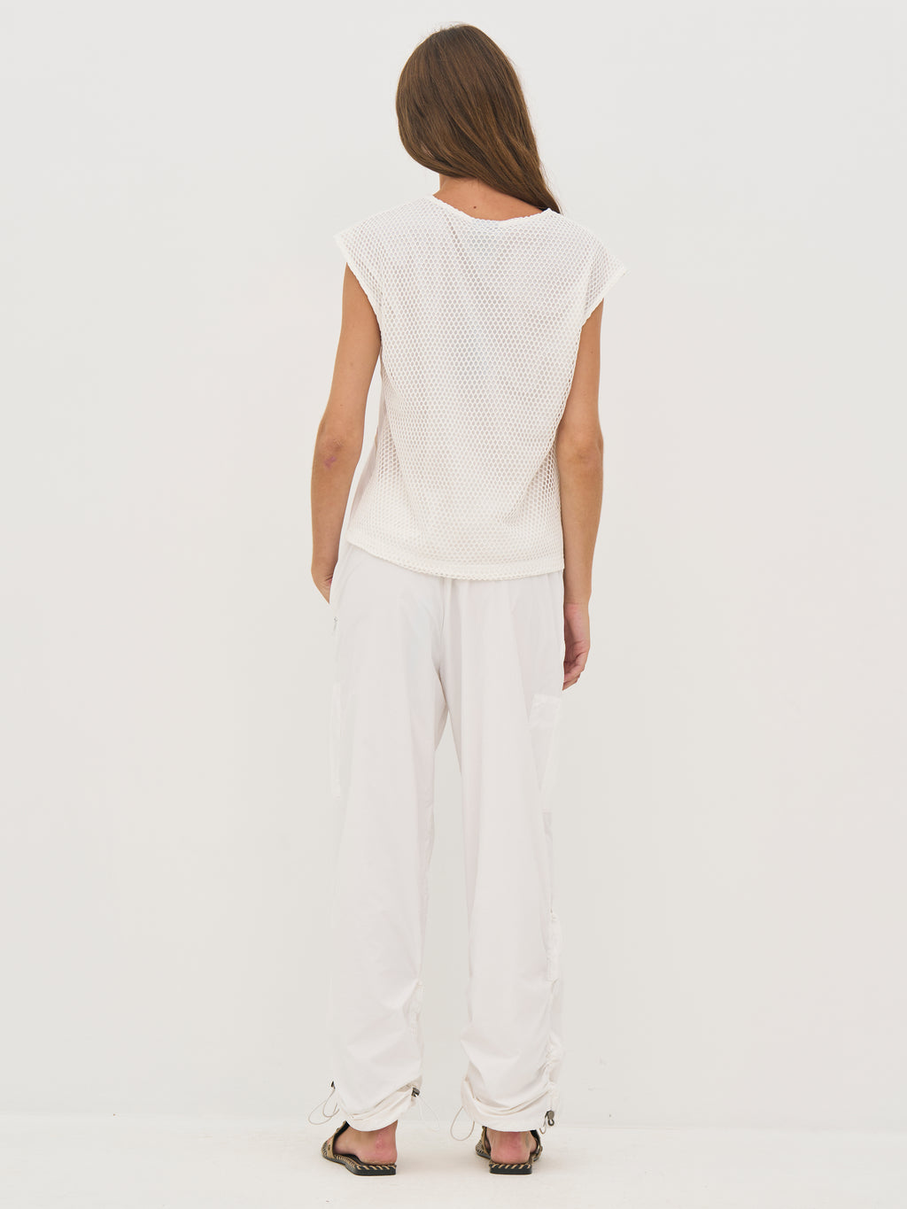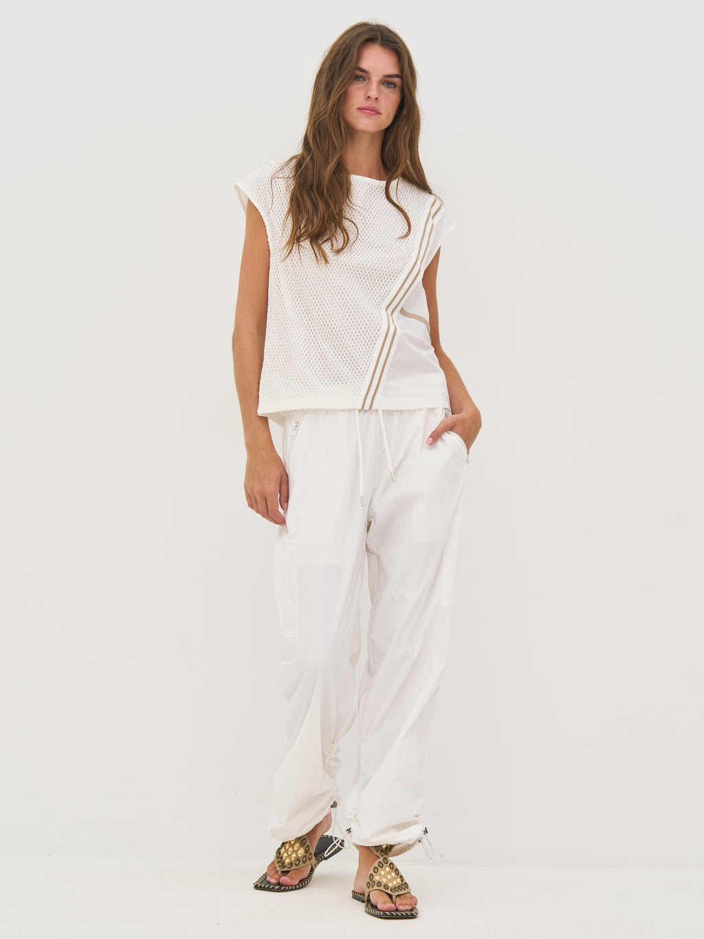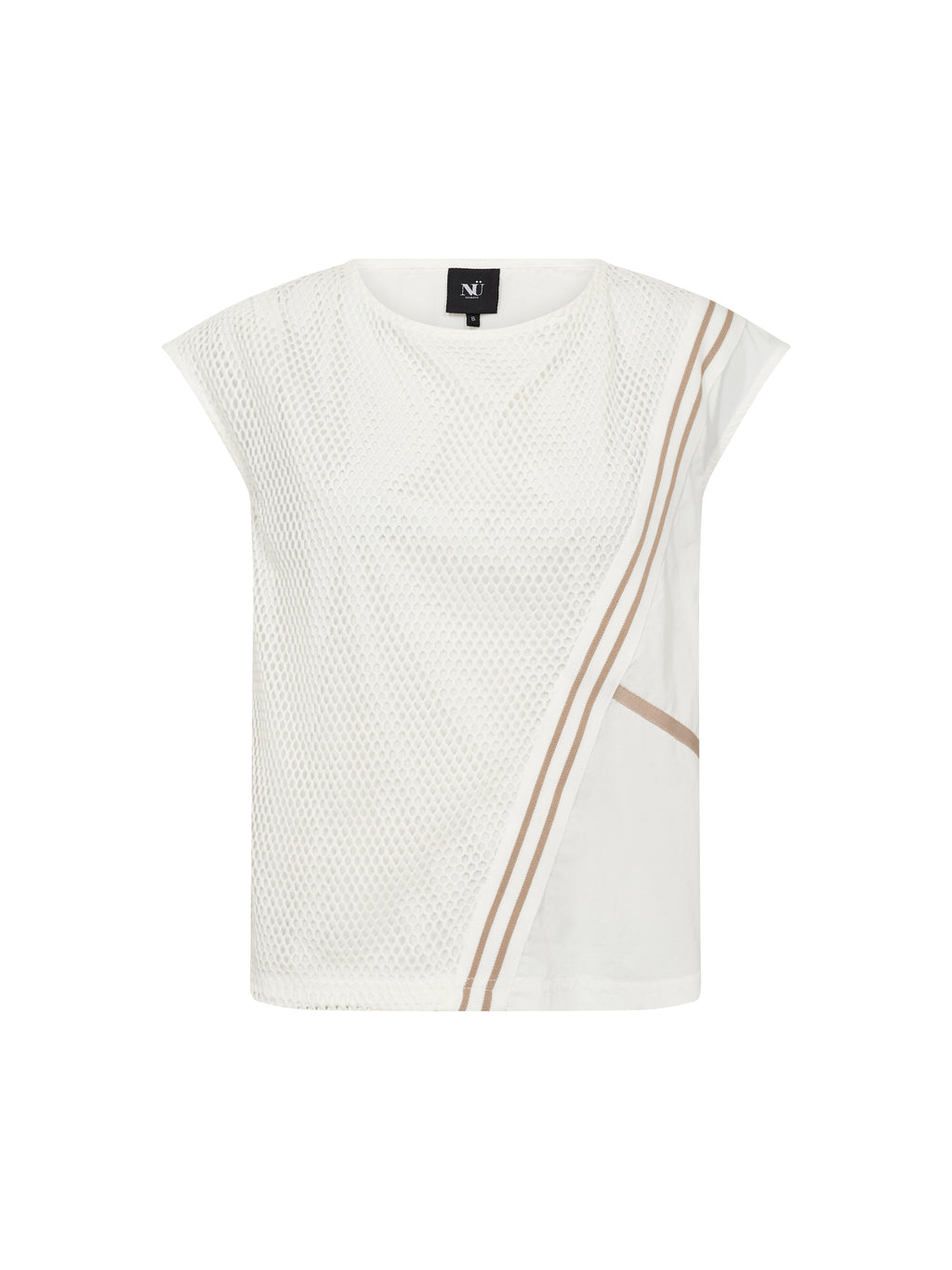 Dieses Oberteil hat einen leichten und luftigen Look mit einer strukturierten Qualität, die ihm einen sportlichen Touch verleiht. Es ist mit einem Innenfutter gestaltet, das für ein bedecktes Aussehen sorgt, während der offene Ausdruck erhalten bleibt. Die diagonalen Streifen fügen ein dynamisches Detail hinzu, während die lockere Passform eine mühelose Silhouette bietet. Am Rücken setzt sich das Design mit dem gleichen Schichtungseffekt fort.
