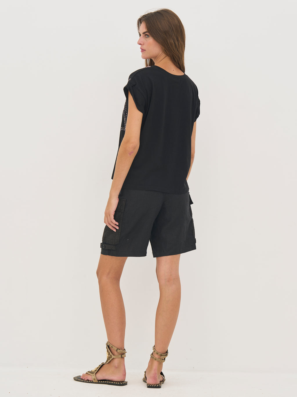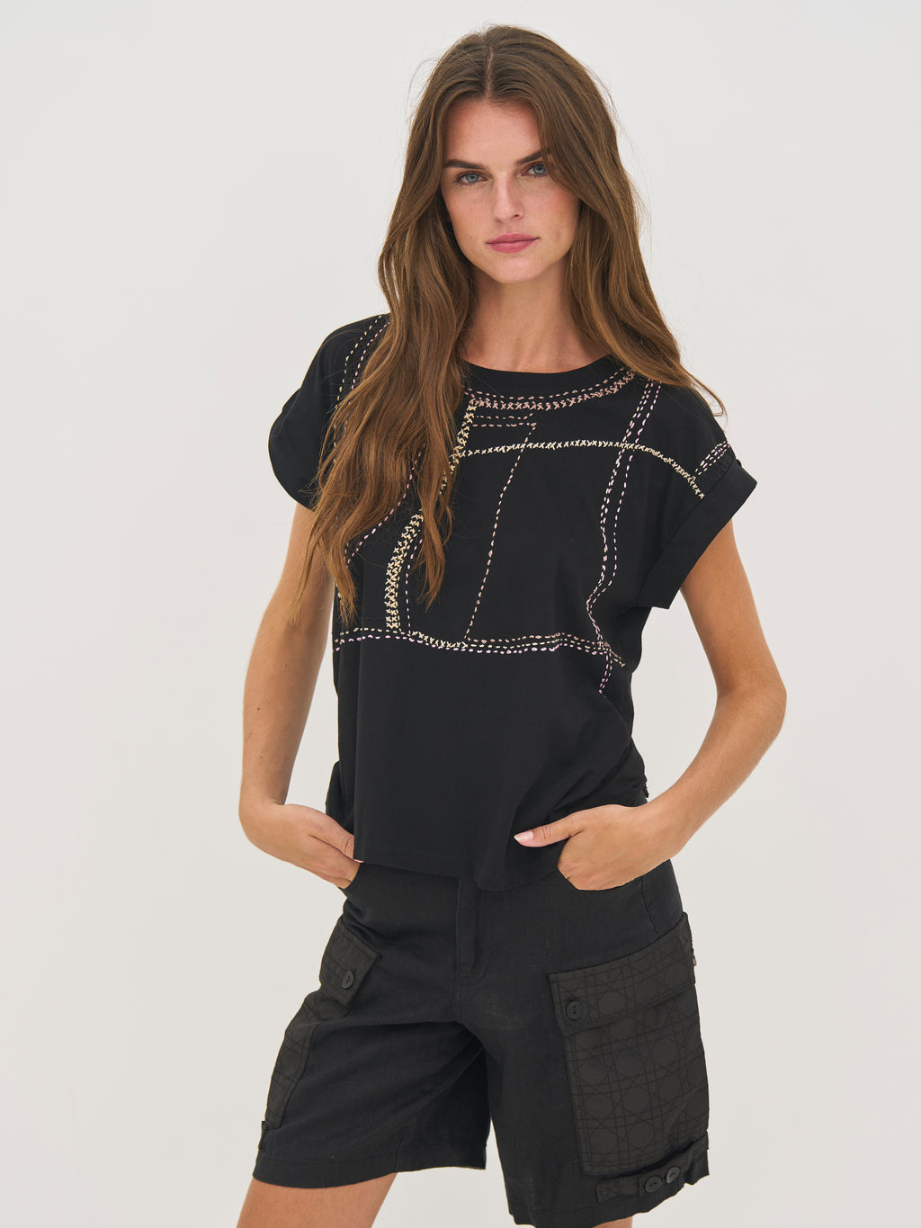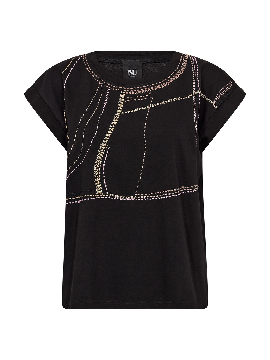 Dieses T-Shirt besteht aus einer weichen Baumwollqualität, die es angenehm und atmungsaktiv für den täglichen Gebrauch macht. Es hat einen schlichten und zeitlosen Look mit einem runden Ausschnitt und einer geraden Passform, die sanft am Körper entlang fällt. Die umgeschlagenen kurzen Ärmel verleihen ihm ein entspanntes Flair, während die dekorative Stickerei vorne ein einzigartiges und grafisches Element hinzufügt. Auf der Rückseite ist das Design schlicht gehalten. Style das T-Shirt mit Jeans oder einem Rock für einen mühelosen Alltagslook oder trage es unter einer Jacke für einen Schicht-Look.