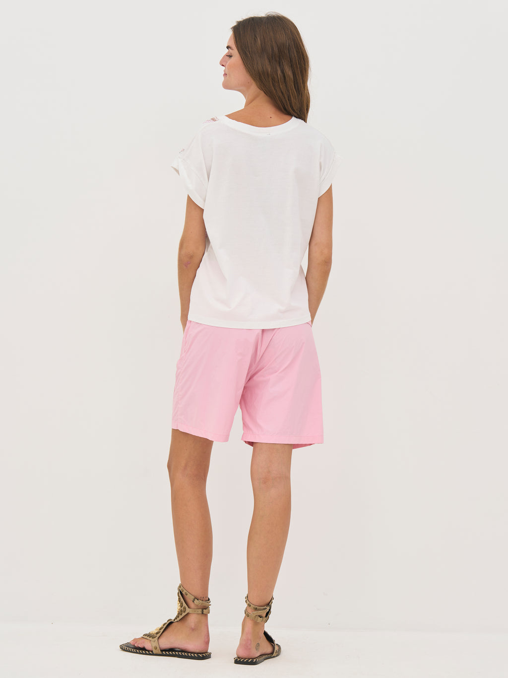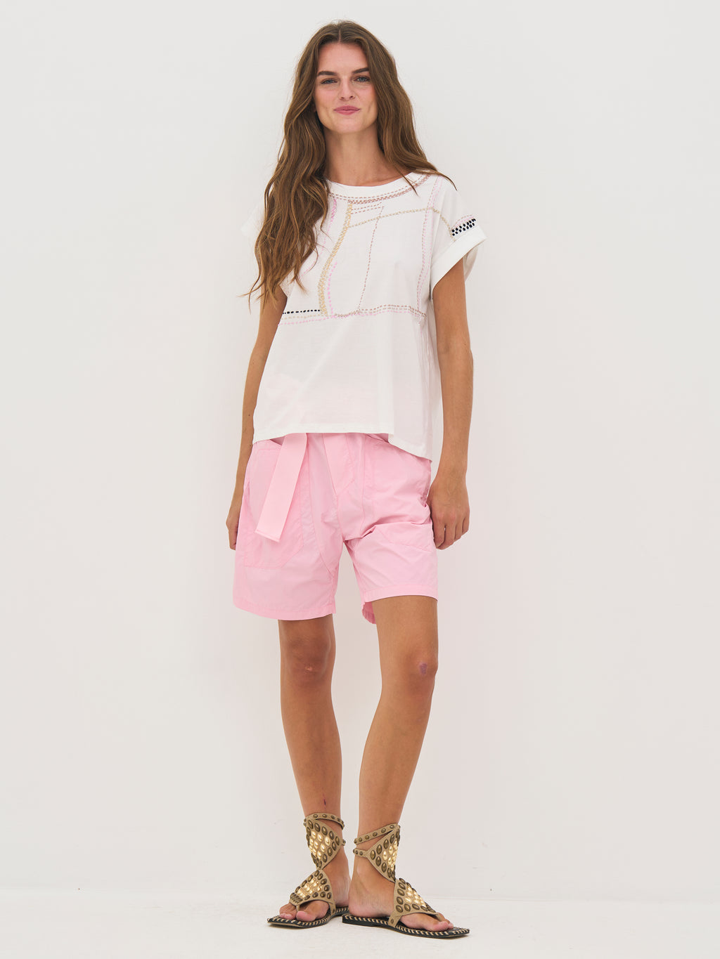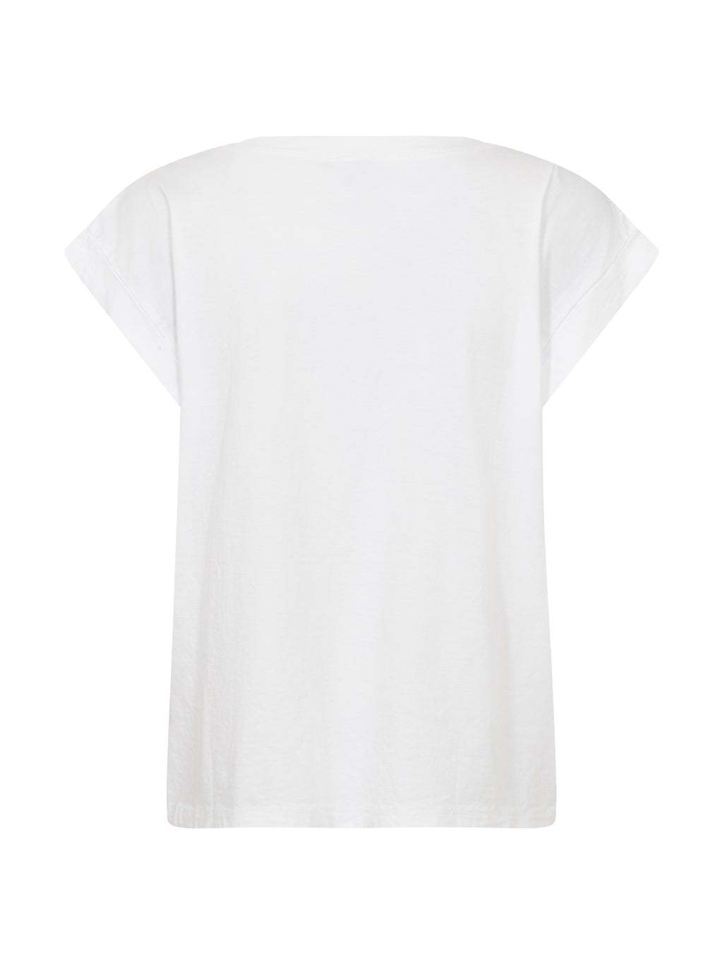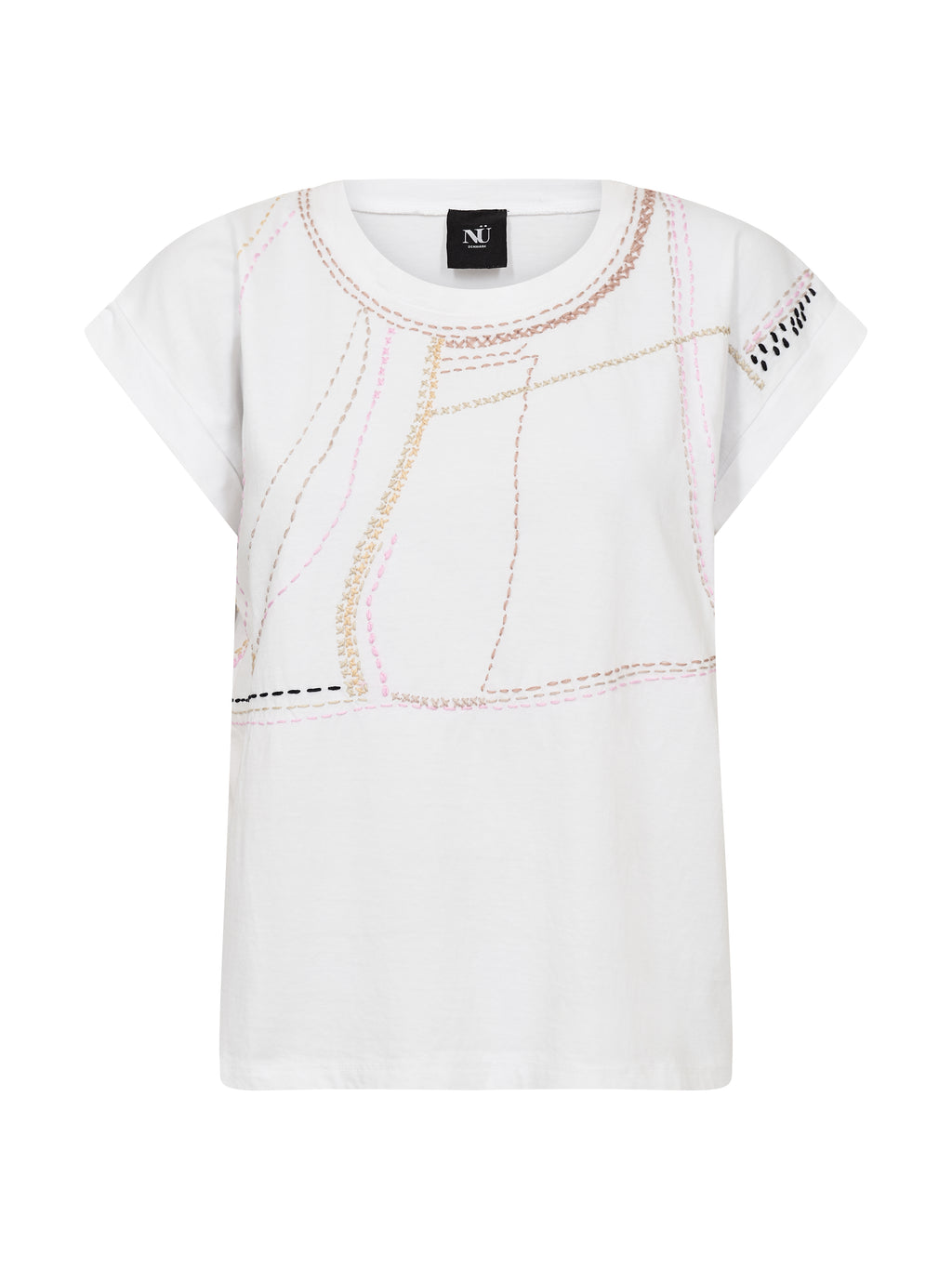 Dieses T-Shirt besteht aus einer weichen Baumwollqualität, die es angenehm und atmungsaktiv für den täglichen Gebrauch macht. Es hat einen schlichten und zeitlosen Look mit einem runden Ausschnitt und einer geraden Passform, die sanft am Körper entlang fällt. Die umgeschlagenen kurzen Ärmel verleihen ihm ein entspanntes Flair, während die dekorative Stickerei vorne ein einzigartiges und grafisches Element hinzufügt. Auf der Rückseite ist das Design schlicht gehalten. Style das T-Shirt mit Jeans oder einem Rock für einen mühelosen Alltagslook oder trage es unter einer Jacke für einen Schicht-Look.