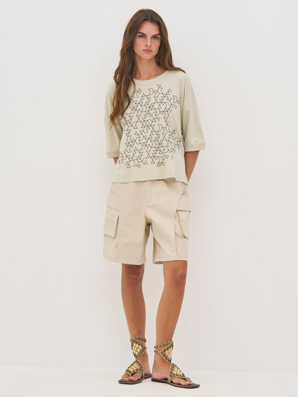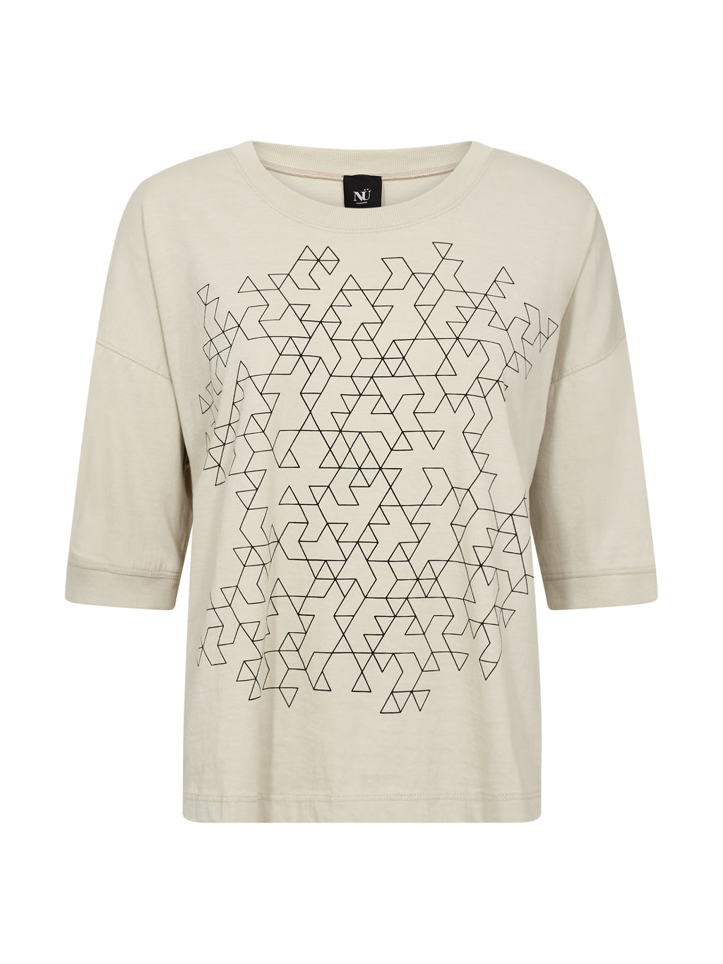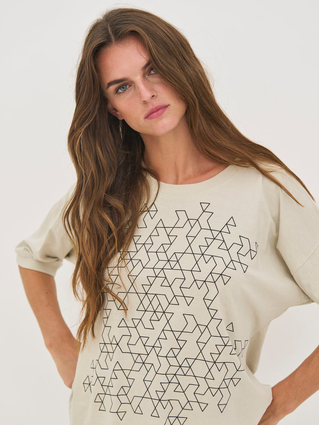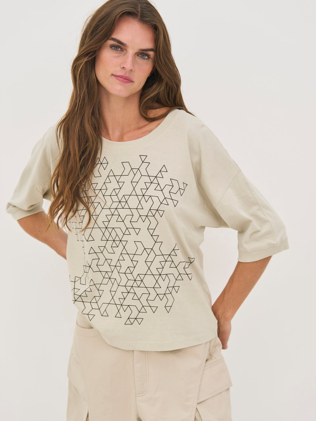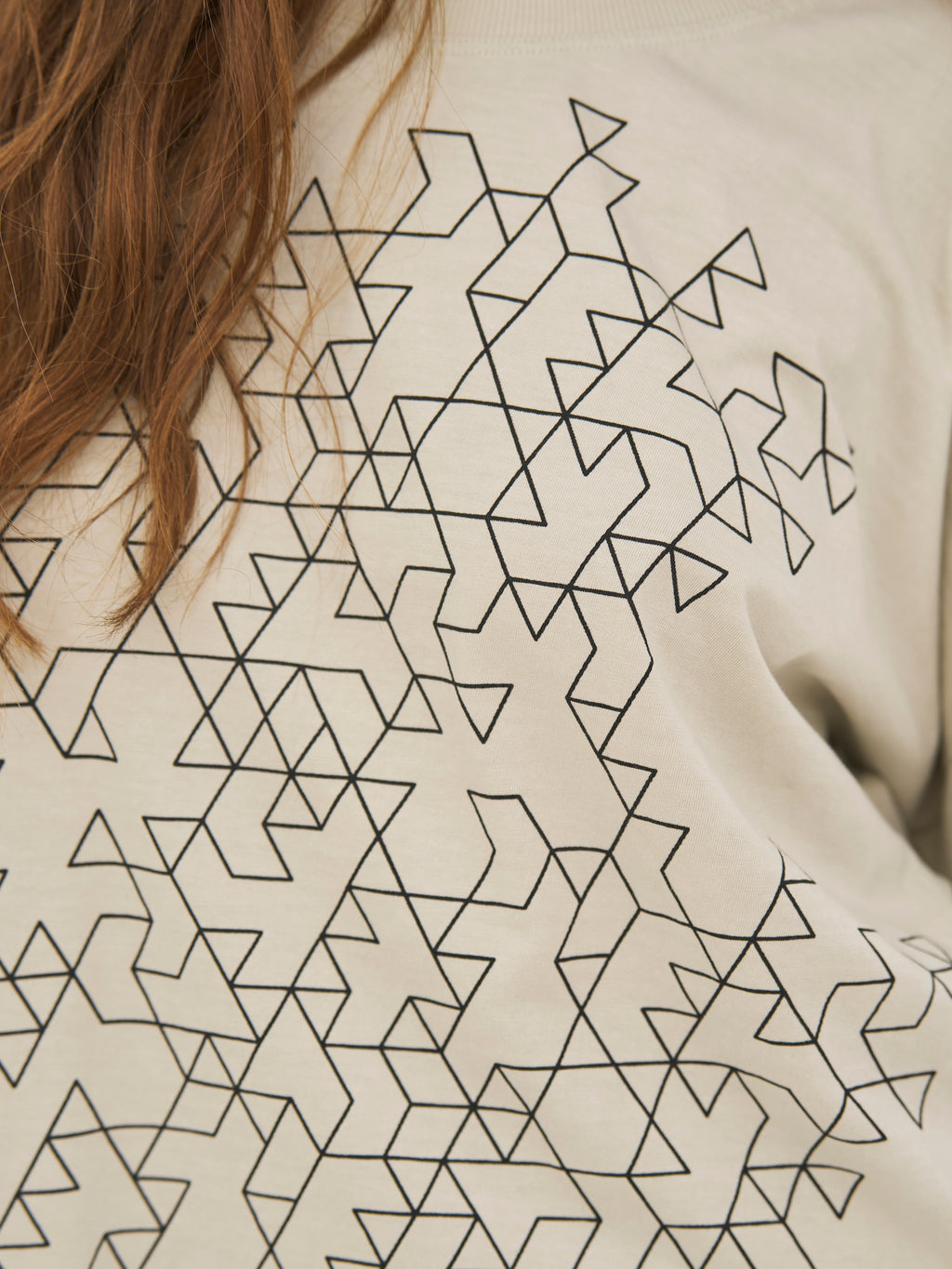 Diese Bluse ist aus weichem Baumwolljersey gefertigt, der ein angenehmes und entspanntes Tragegefühl für den Alltag bietet. Sie hat eine lockere Passform mit überschnittenen Schultern, die ein müheloses und modernes Aussehen erzeugen. Der grafische Druck auf der Vorderseite verleiht ein markantes und zeitgemäßes Element, während der Rundhalsausschnitt und der gerade Saum das Design schlicht halten. Auf der Rückseite setzt sich der saubere und entspannte Look fort.